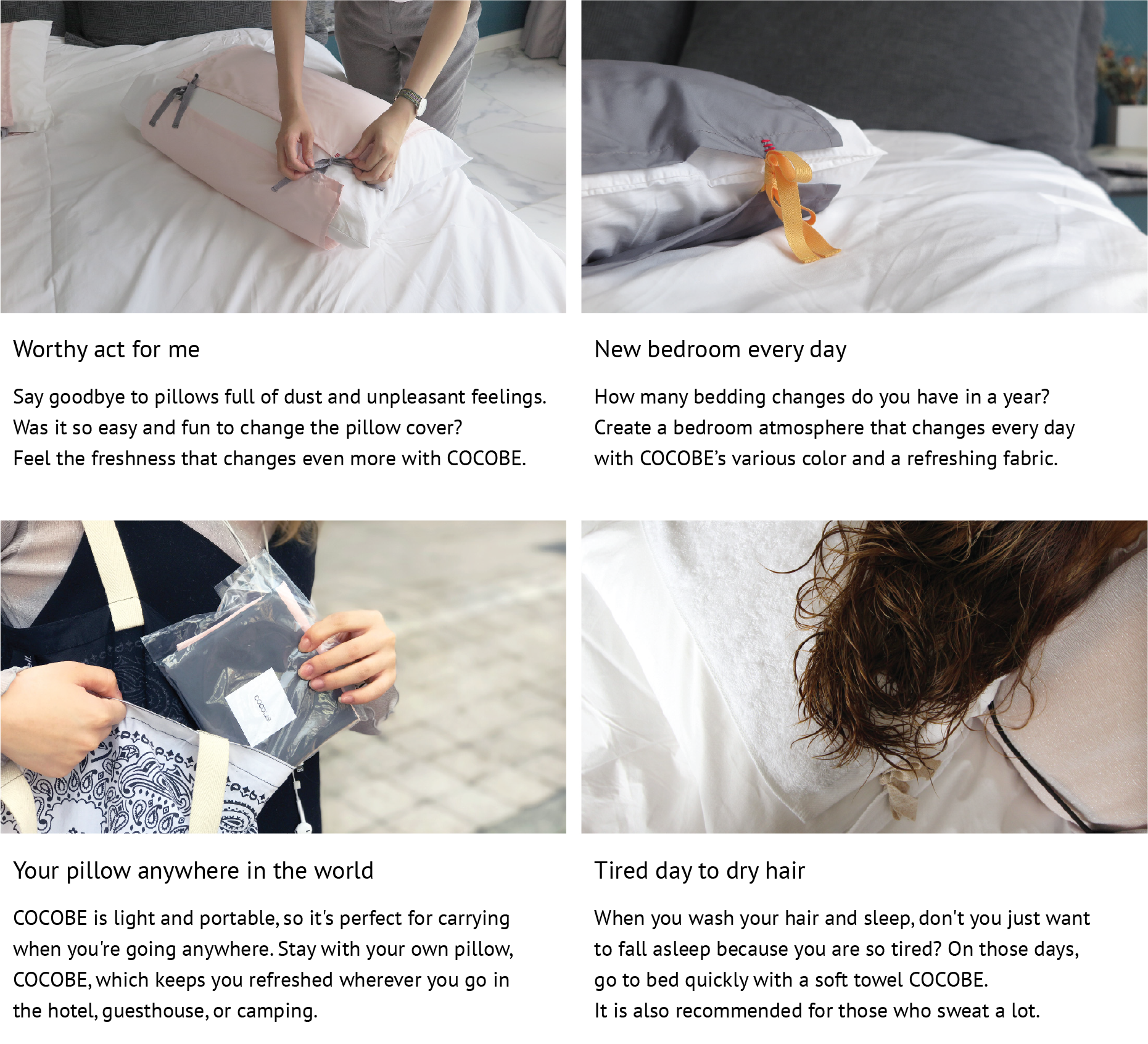 Our team, which has set the ultimate goal of 'quality' and 'convenience' in the Cocobe project, has launched the Cocobe through a total of seven tests and product modifications. We researched the best way to easily replace the cover and found the most suitable fabric for the function of the product. Also, it was made with endless consideration so that it can be applied to various sizes of pillows as a single product.