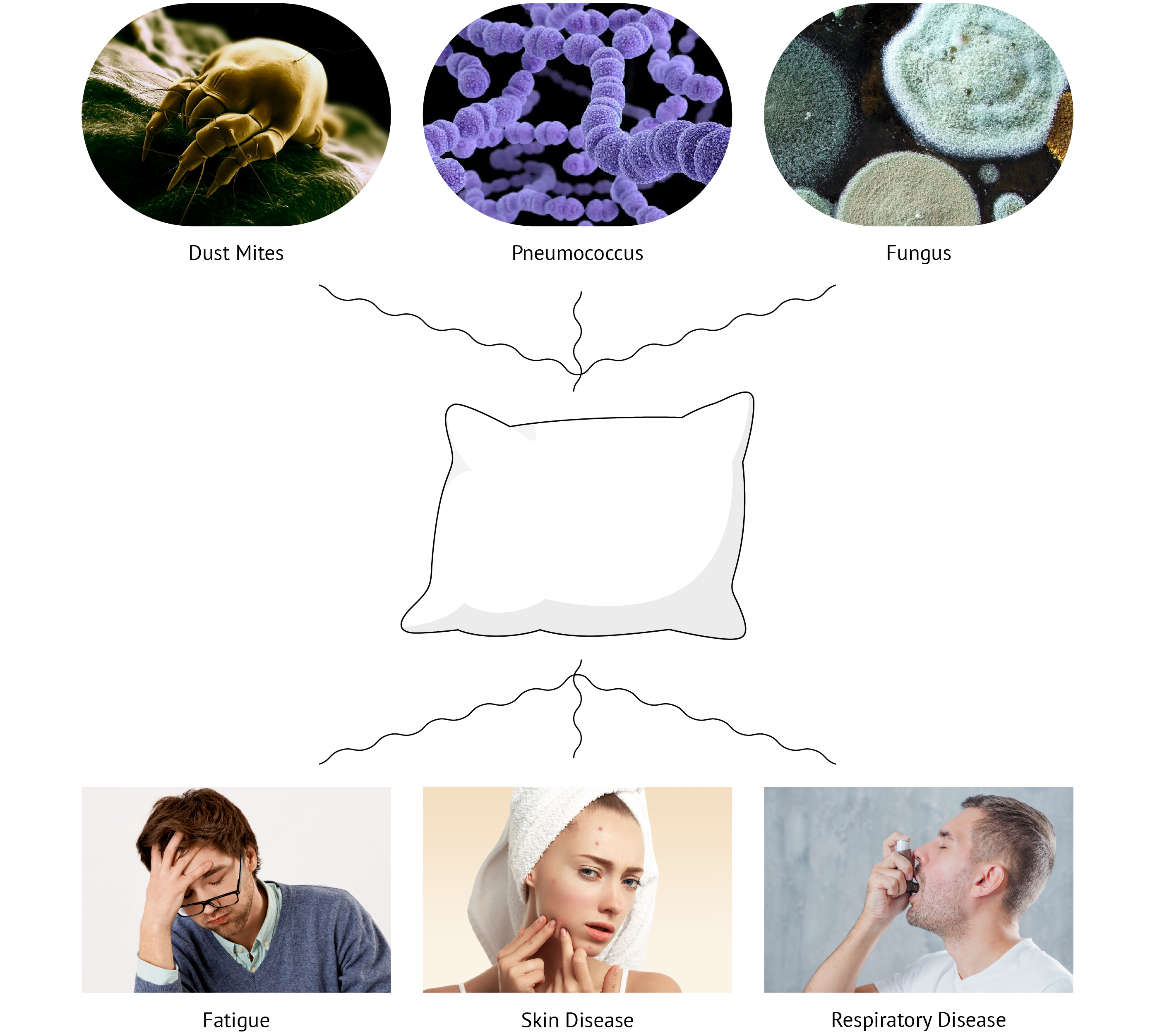 Beddings such as blankets and pillows are products that we use and touch every day, so we need regular hygiene control. Among them, pillows are especially more susceptible to contamination than other beddings due to saliva, sweat, dead skin cells, and oils from the scalp or face, which provides a very ideal environment for the propagation of microorganisms harmful to the human body, such as bacteria, fungi, and mites.