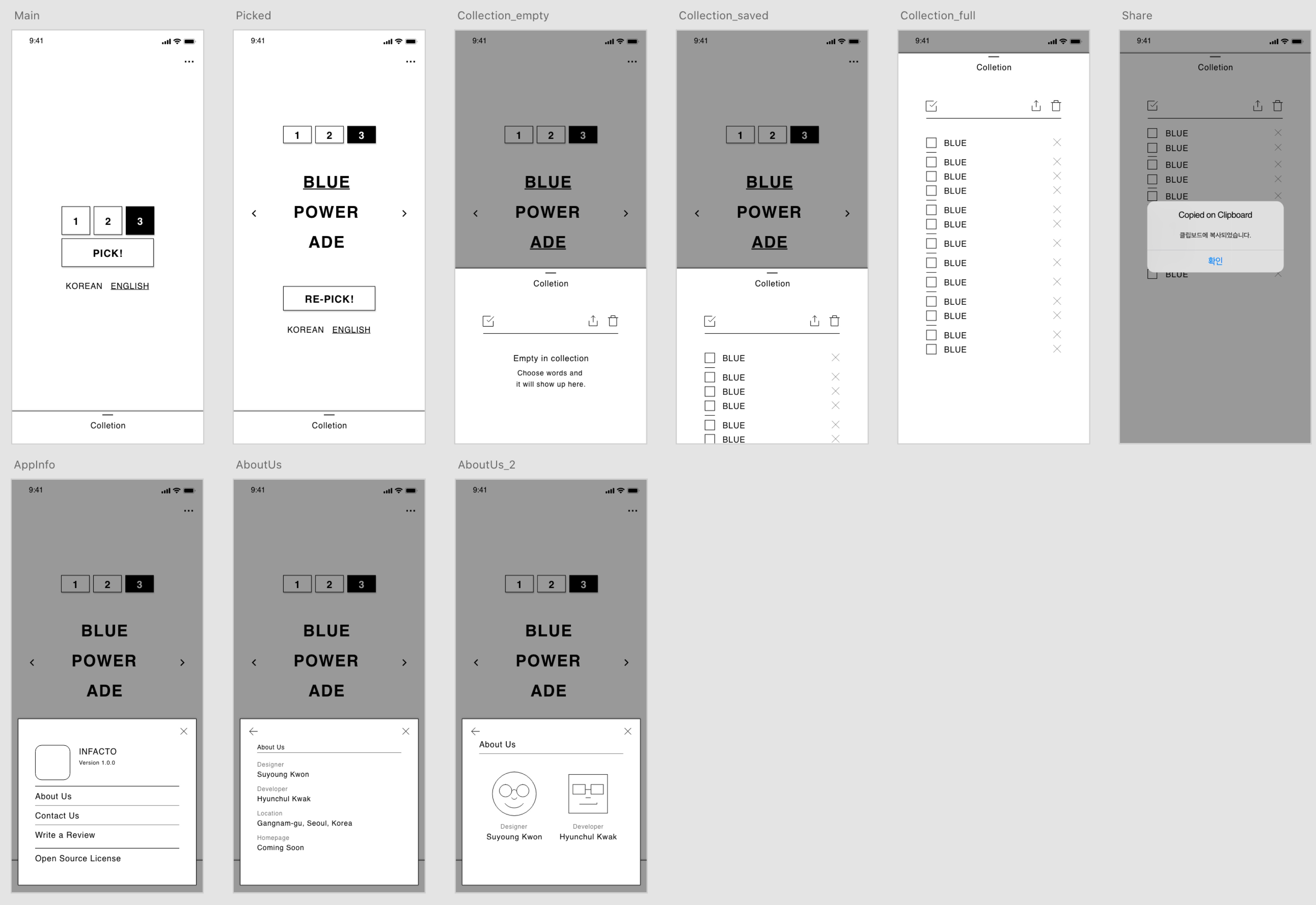 After discussing the features to be implemented in the first release, I created prototype screens in Adobe XD. Since the functions to be implemented were relatively simple, I tried to solve most functions within the main screen for minimal depth. In this process, I thought about the essential and optimal interaction with the developer. Also, we have decided on the types of words to be provided by the application. In order to provide apps for all ages, we have selected about 15,000 Korean words and 5,000 English words that are most frequently used, excluding profanity.