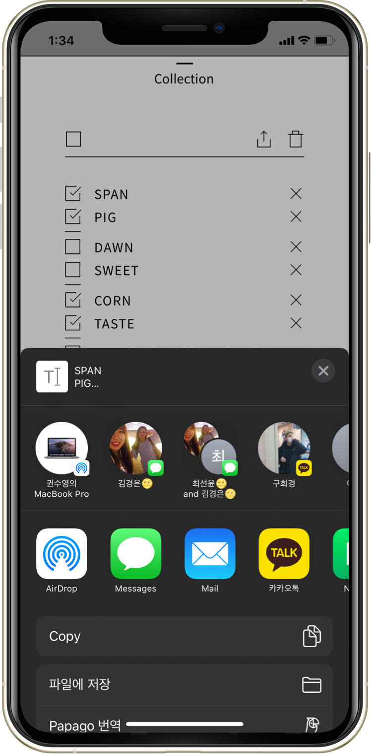 Do you want to transfer the words from the collection to another app? You can copy and paste selected words as well as easily transfer them to various apps such as messenger, mail, and memo.
