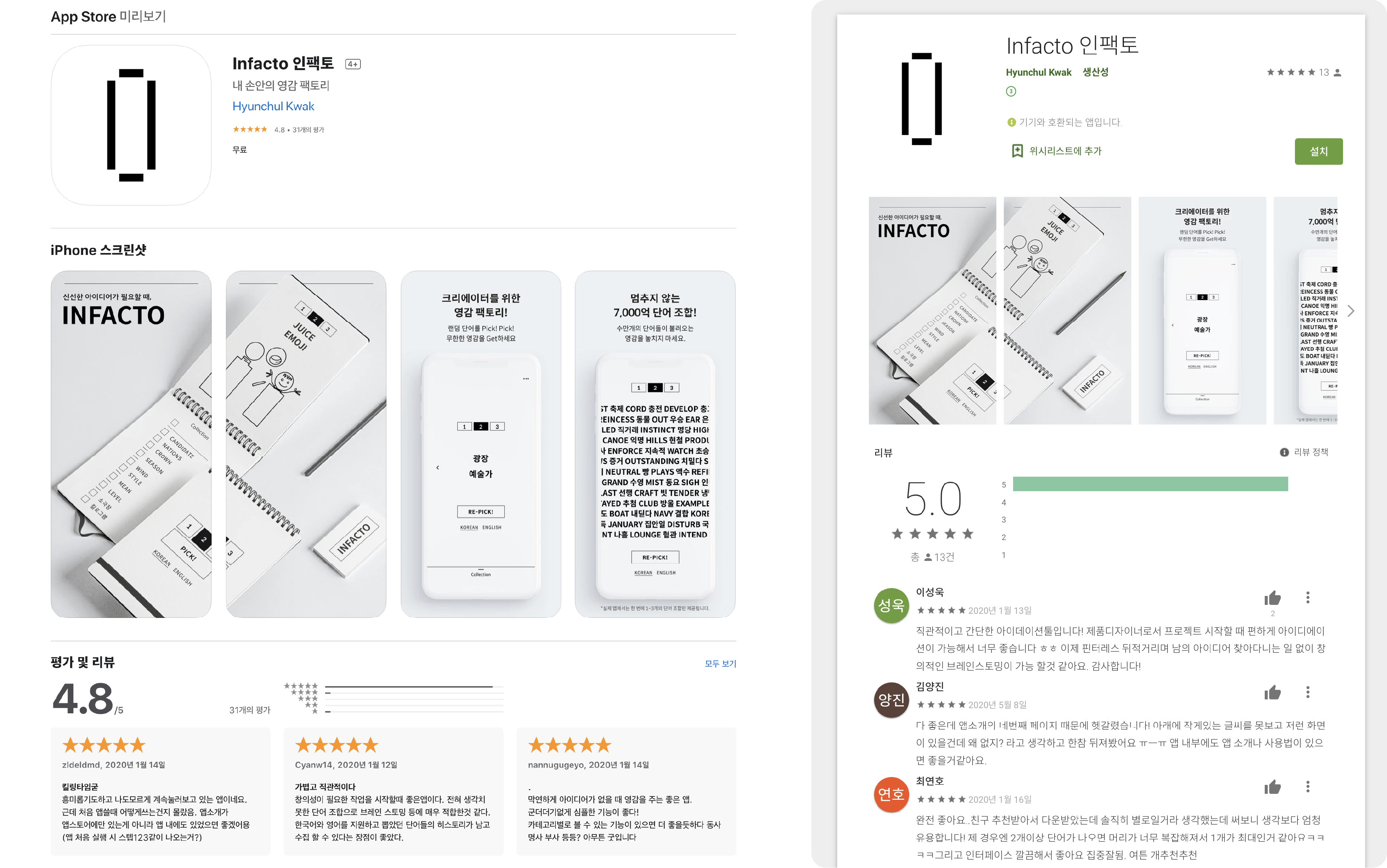 INFACTO is currently available for download on the App Store and Google Play Store, and has received a rating of 4.8 points on the App Store and 5.0 points on the Play Store. Below are some of the reviews from INFACTO users on both stores.