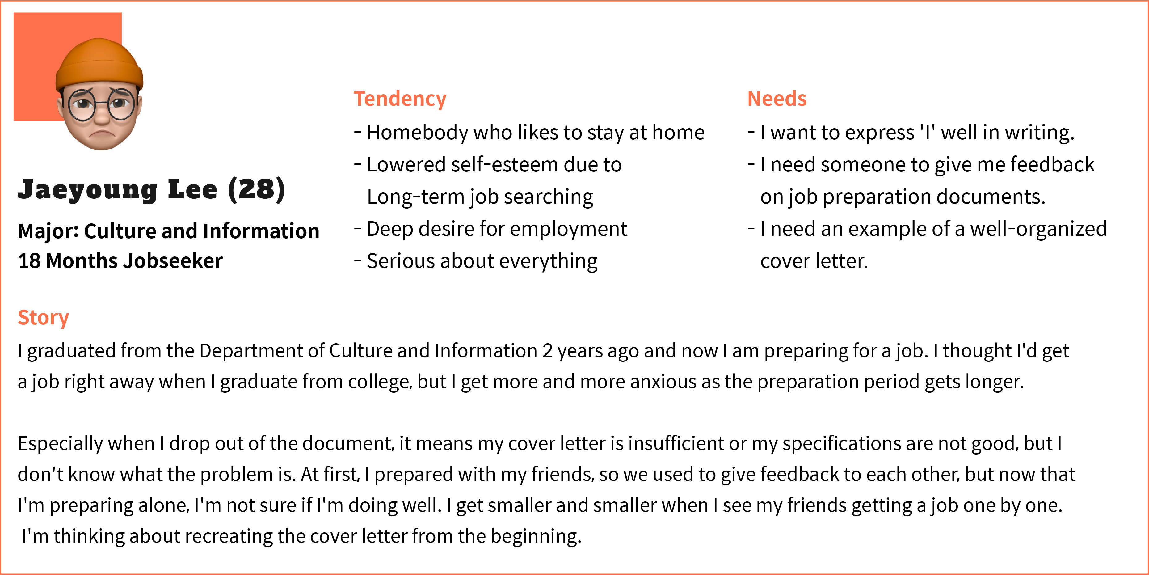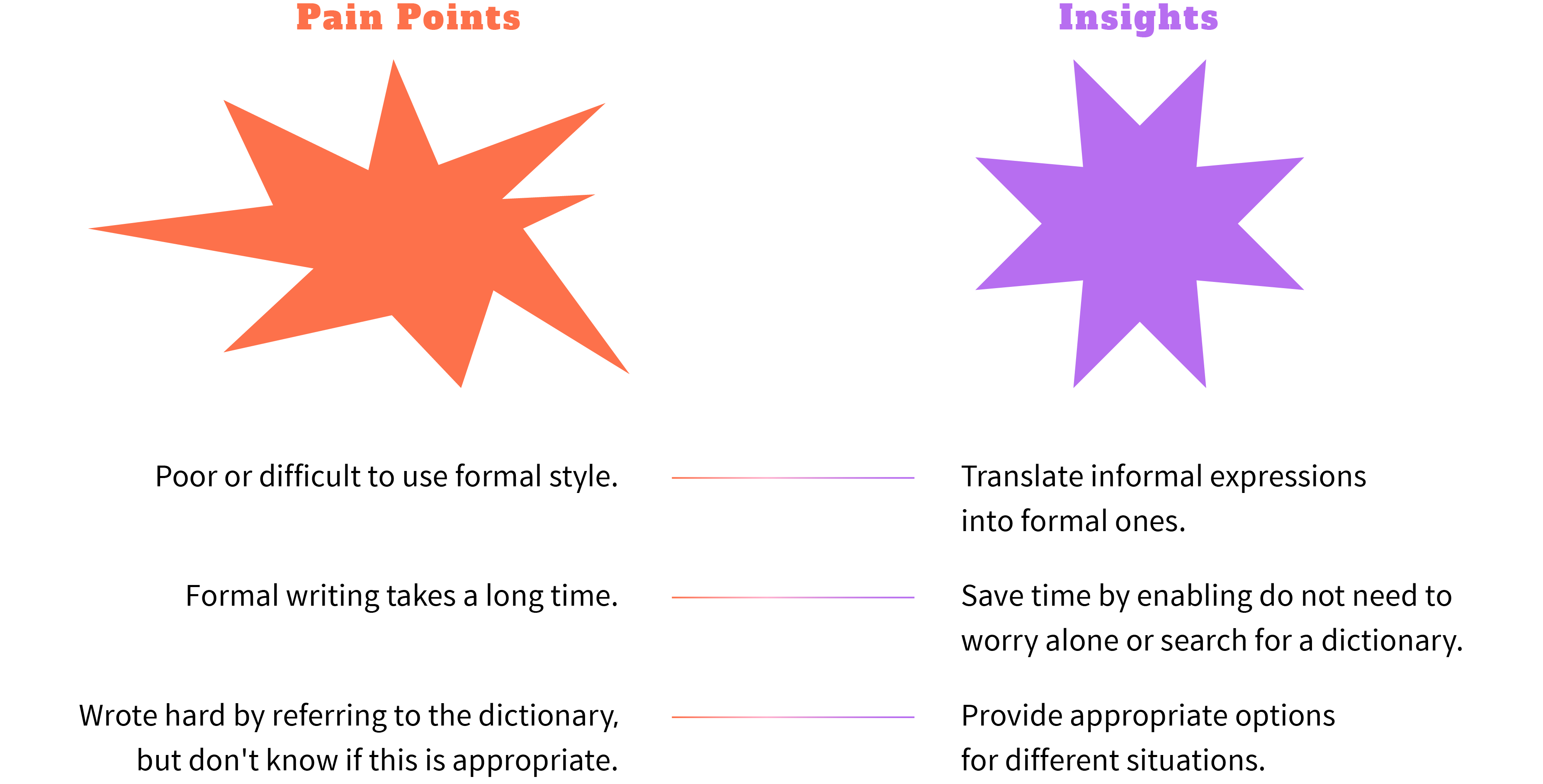 Pain points: We focused on the three main phases—Before writing, During writing, and After writing—to figure out pain points in each touchpoint. As a result, our team figured out that saving time and giving assurance to the users are the most important part.