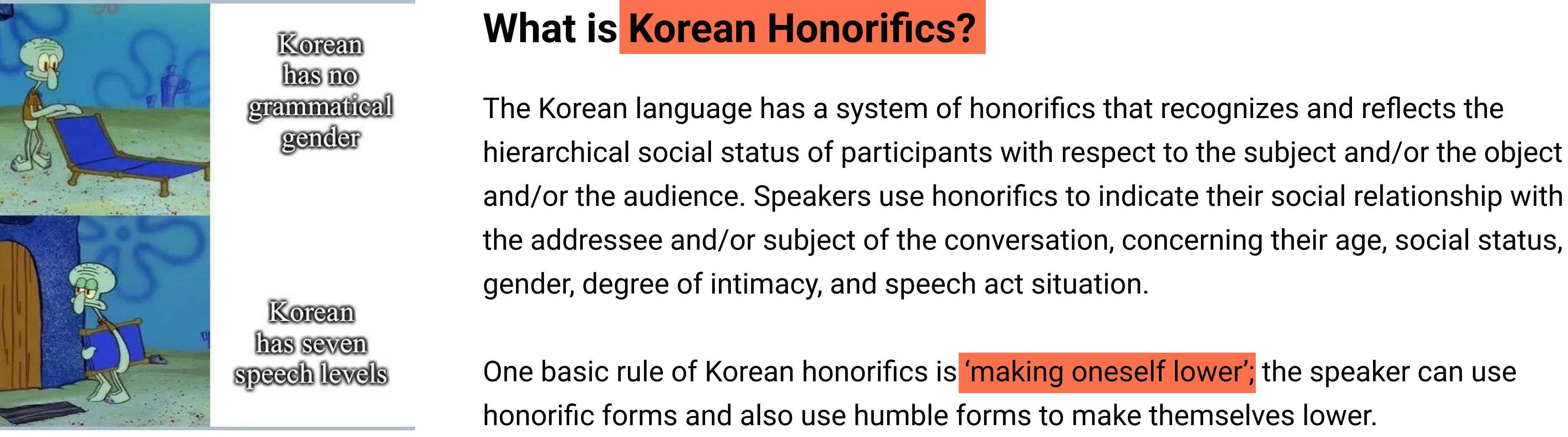 Koreans learn how to use honorification from a young child since they consider using honorifics as the basis. The reason for the importance of honorification in Korean is that it is required by the vertical hierarchy of Confucianism, where age and social status play a big part. An idiom 장유유서(長幼有序) is the one that shows the basis of Confucianism, which means there is a strict order that needs to be followed and obeyed between adults and children. Therefore, it is a huge deal in Korea to show proper respect to older people, whether they are physically older or of a higher social status.