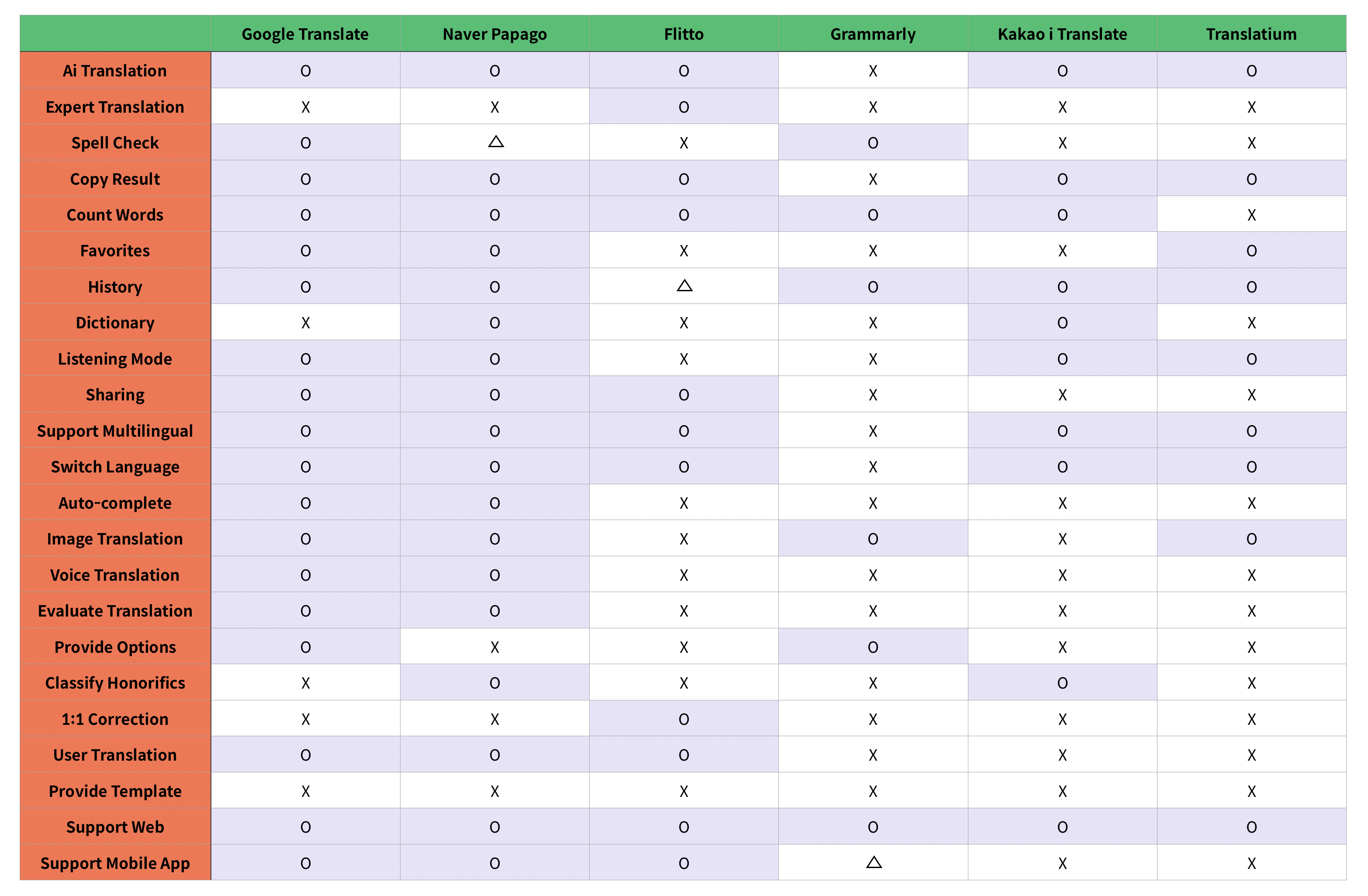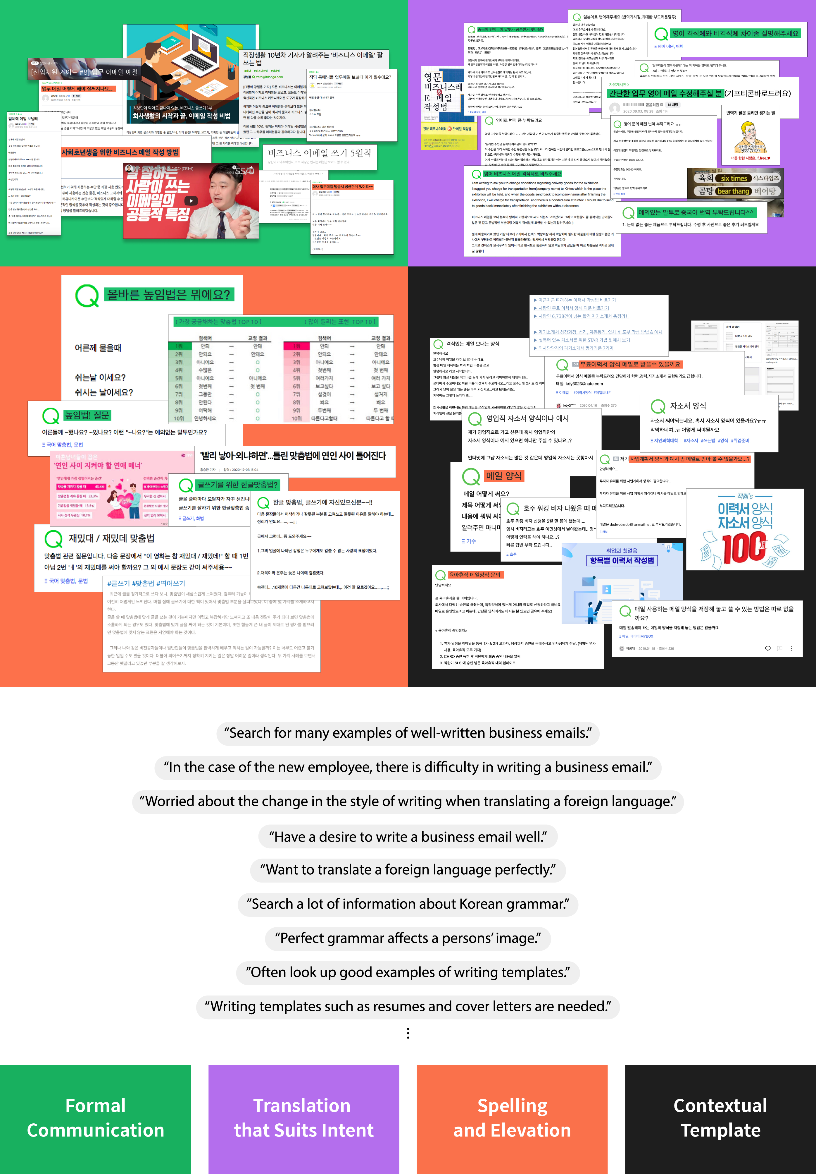 To understand the existing translation service and proofreading service, we decided to conduct competitive research. We were able to confirm that while simple spelling tests and foreign language translation services have already been developed, there is no service yet that converts colloquial expressions into formal writing. We also confirmed that professional correction service takes time and money.