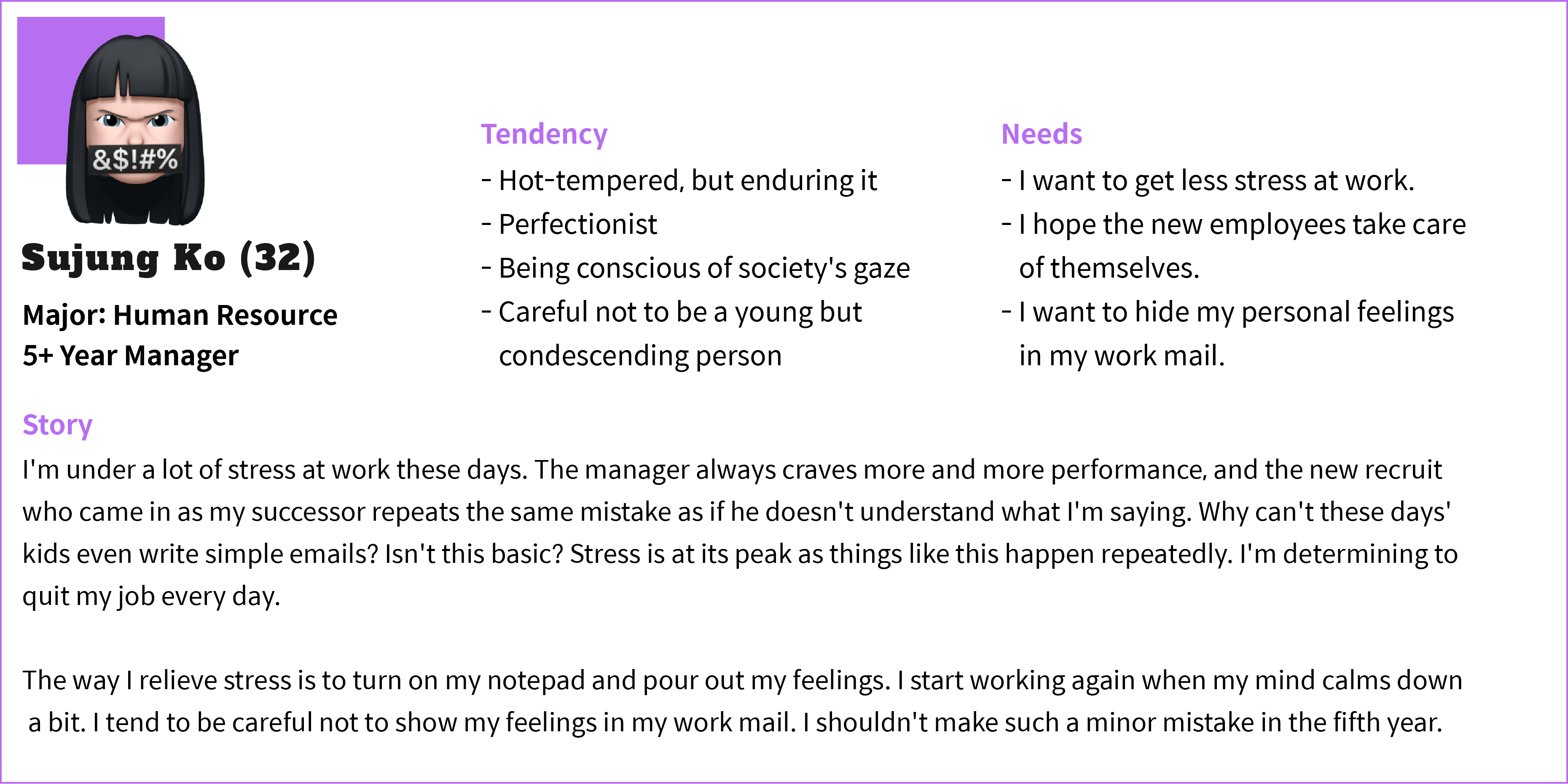 According to our analysis of the research and problems, we created these personas to further empathize with our participants’ needs and frustrations.