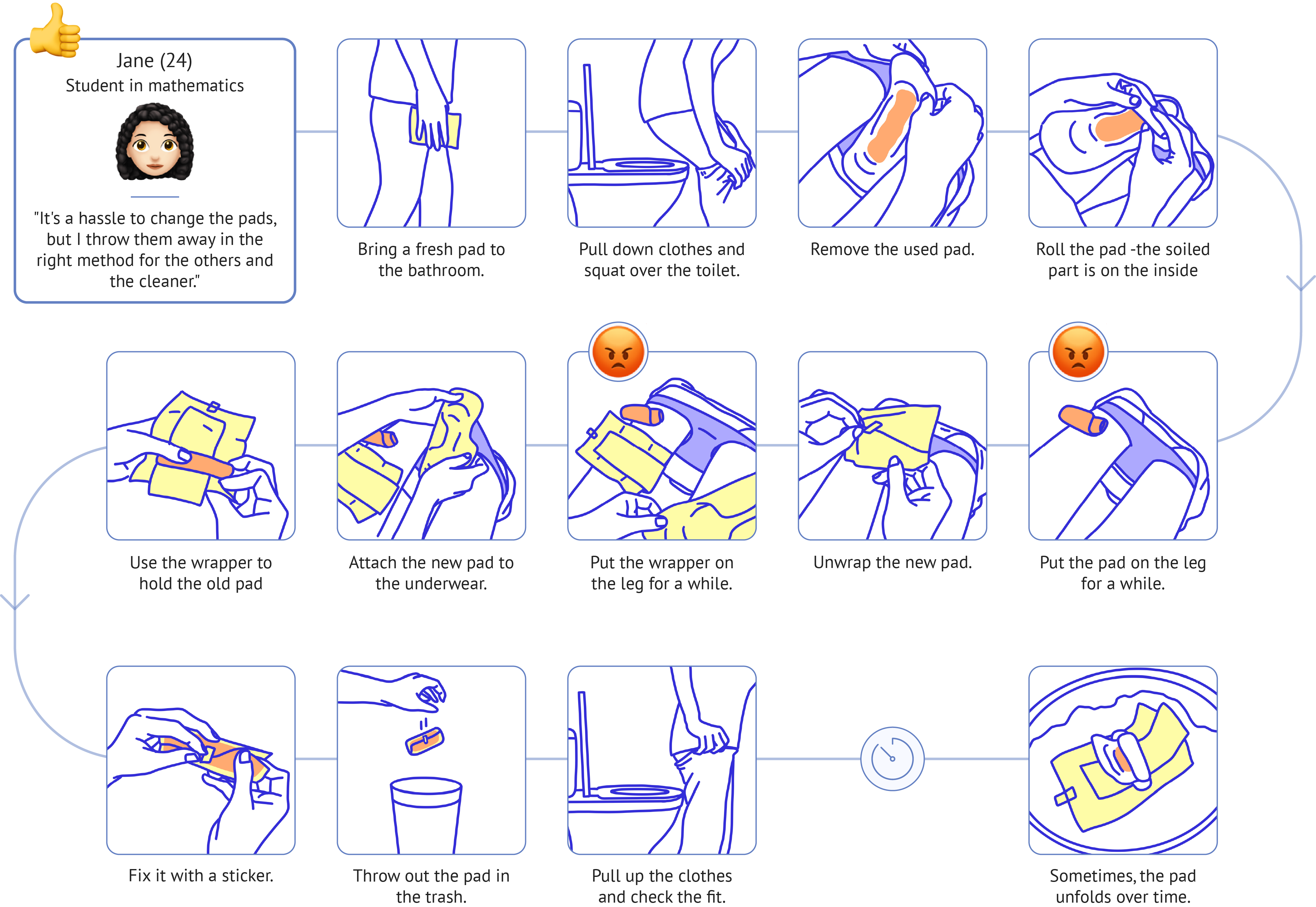 Among the answers I got in the interview, I found three pain points concerning the problem of the sanitary pad being thrown open.
