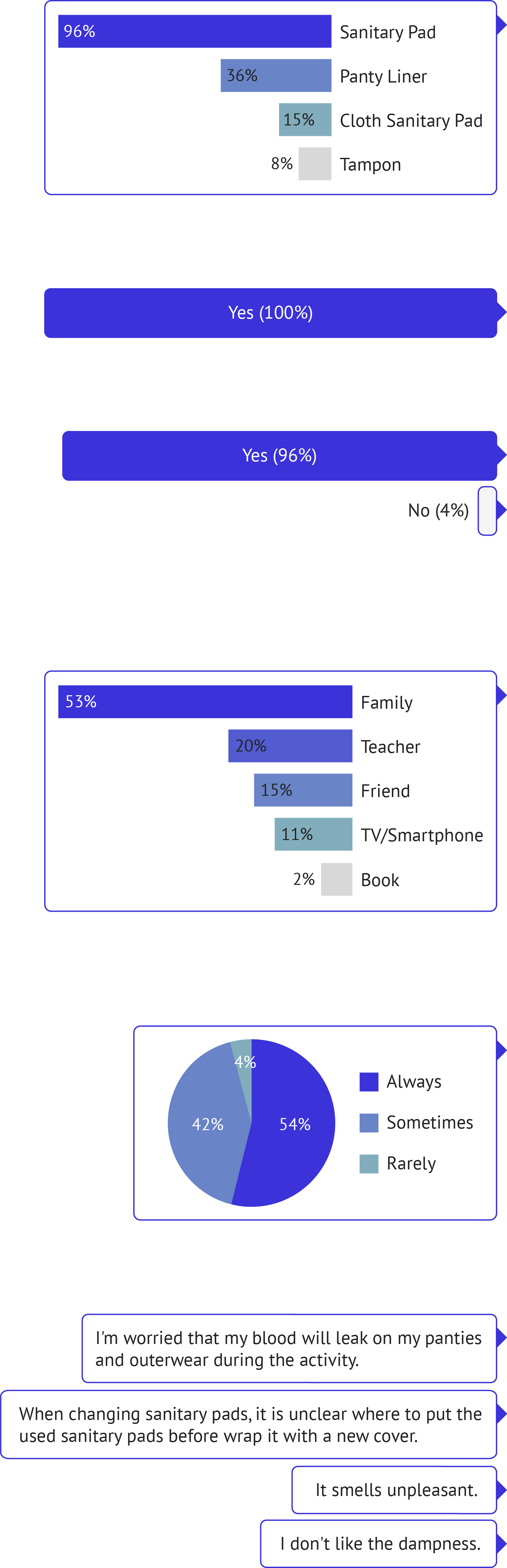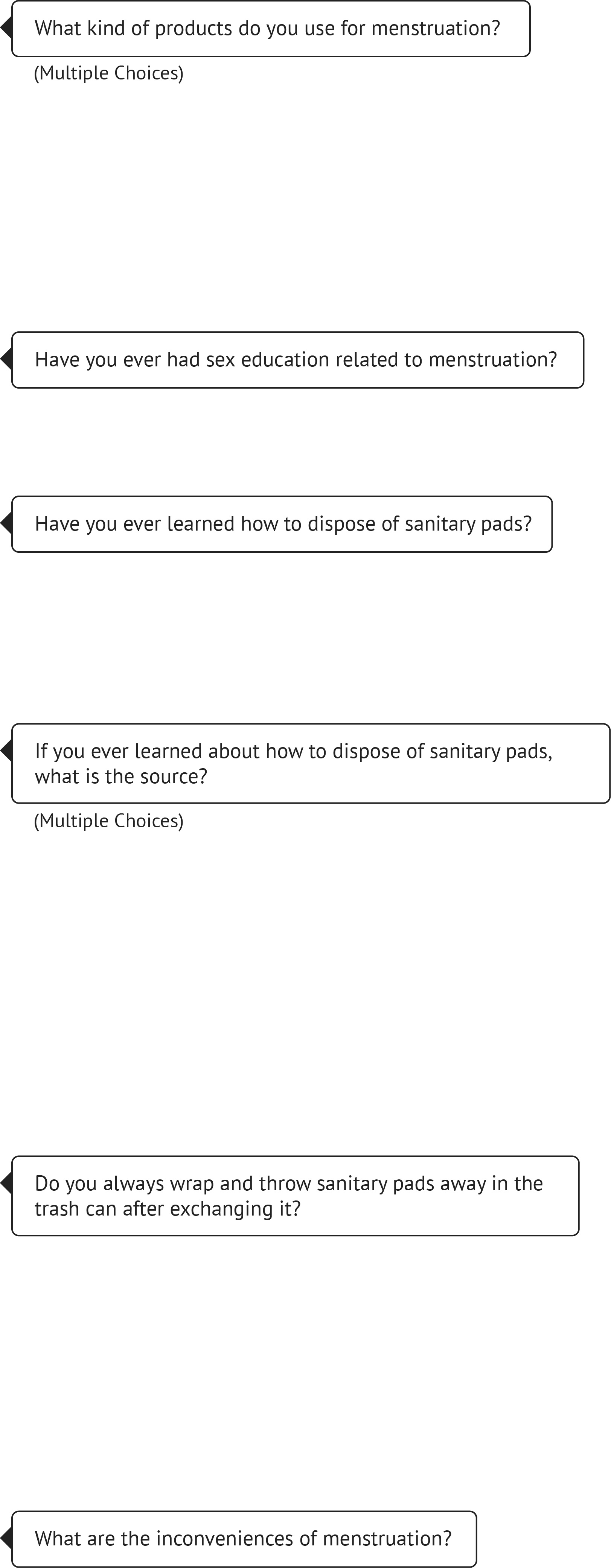 I conducted a simple interview with 68 users to investigate whether people have experience in sex education on how to dispose of sanitary pads, or whether they are familiar with the correct method. Also, as discomfort with sanitary pads is a subjective area, everyone has their own discomfort I asked a simple question about the overall inconvenience of using sanitary pads.