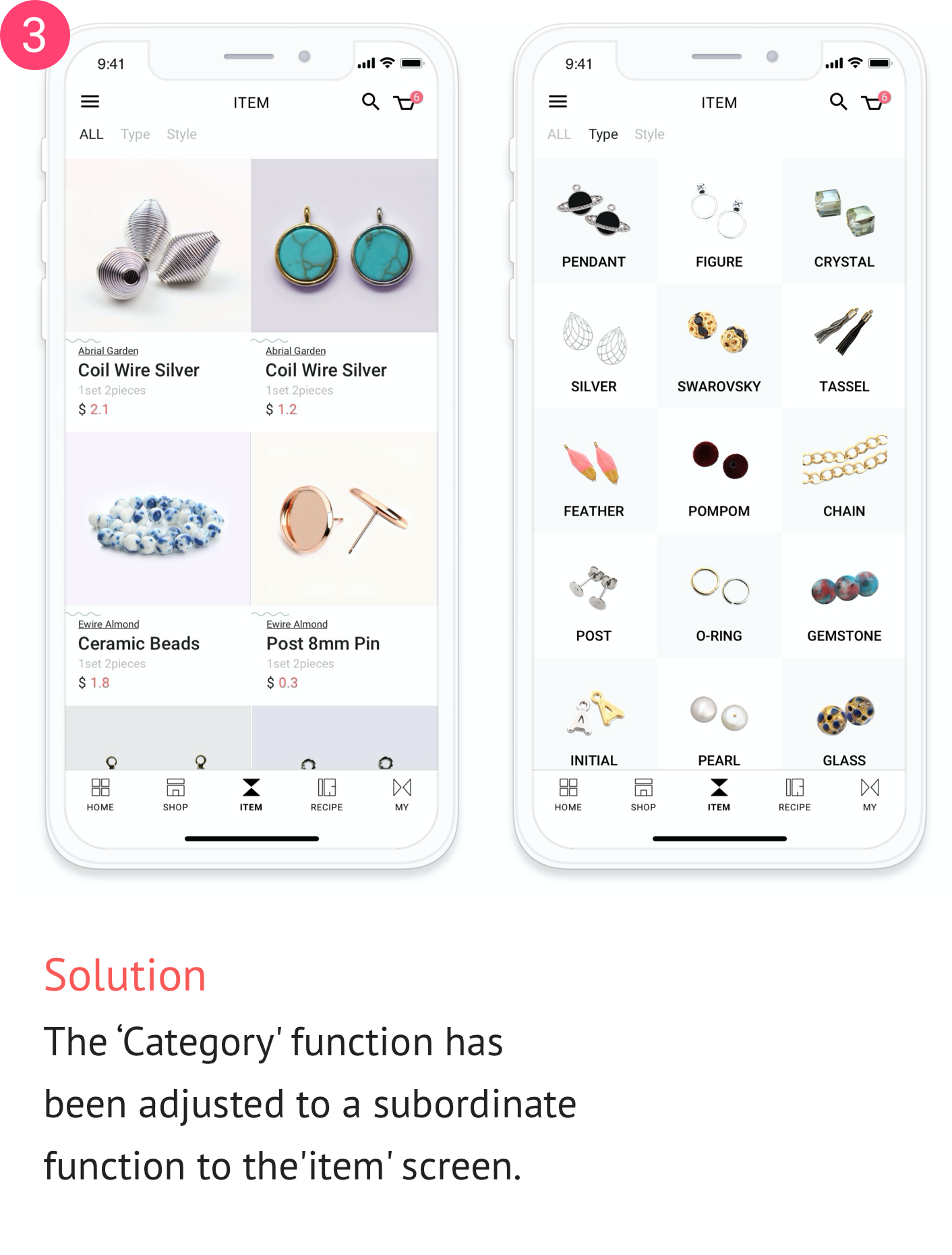 A subsidiary material shopping application that makes transactions more convenient by connecting consumers who want to make cheap and unique jewelry themselves and subsidiary material retailers who want to expand their sales range to the online market.