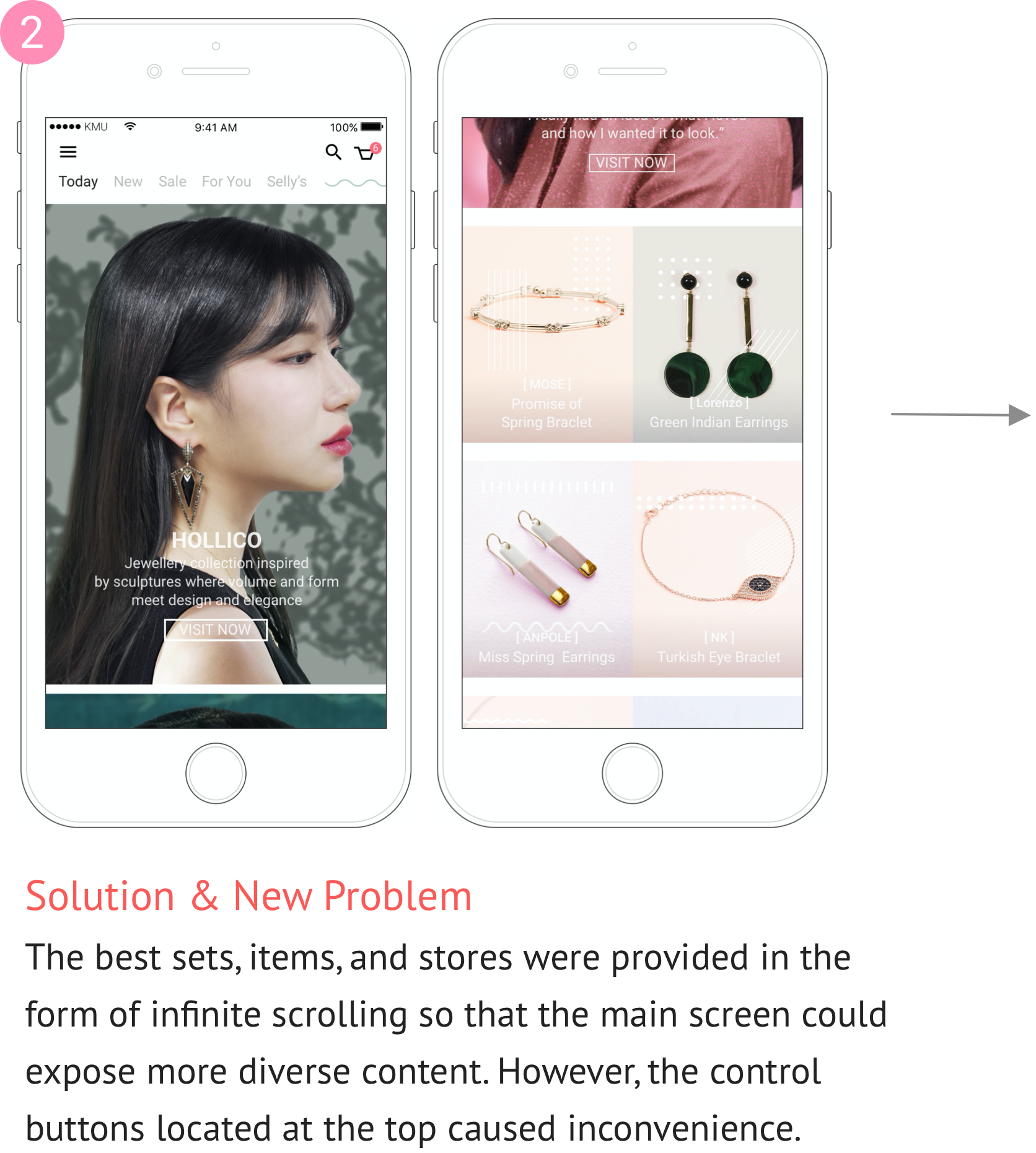 With the working prototype, 2 rounds of usability testing sessions were conducted to examine the usability of the built wireframe and to get feedback and improve the flow of the application. For the first time, we conducted the usability test with 3 general users, and then, we conducted the second usability test with 3 jewelry lovers, 2 general users, and 1 usability expert. The 10 task scenarios were written based on Selly's overall use process. At this point, our goal was discovering the user's gaze and expectations, the intent of operation, and the errors in design.